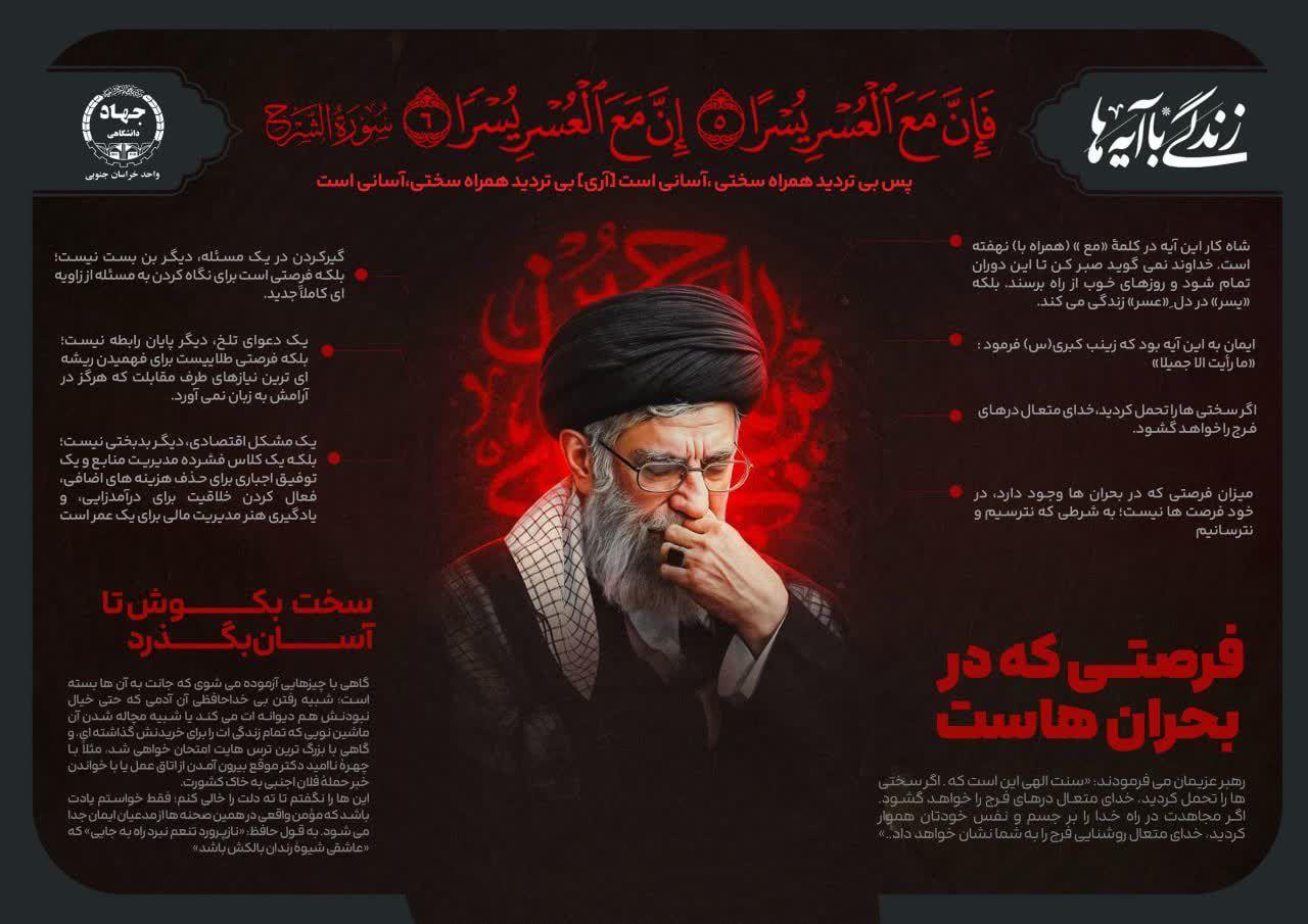 به گزارش روابط عمومی جهاددانشگاهی خراسان جنوبی، در یکی از این طرحهای گرافیکی، با نگاه به آیات ۵ و ۶ سوره انشراح؛ «فَإِنَّ مَعَ الْعُسْرِ یُسْرًا؛ إِنَّ مَعَ الْعُسْرِ یُسْرًا» به تبیین چگونگی گذر از رنجها و بحرانها از نگاه رهبری و با تکیه بر آیات قرآن کریم پرداخته شده است.