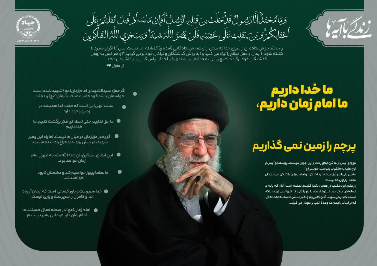 به گزارش روابط عمومی جهاددانشگاهی خراسان جنوبی، معاونت فرهنگی جهاد دانشگاهی خراسان جنوبی در تازهترین اقدام فرهنگی خود، طرح گرافیکی «زندگی با آیهها» را با محوریت آیات قرآن کریم اجرا کرده است. در یکی از این طرحها با رویکردی هنری تلاش دارد پیام روشن آیه ۱۴۴ سوره آلعمران را درباره ثبات قدم و استمرار مسیر حق در شرایط دشوار به زبان بصری برای مخاطبان به تصویر بکشد.