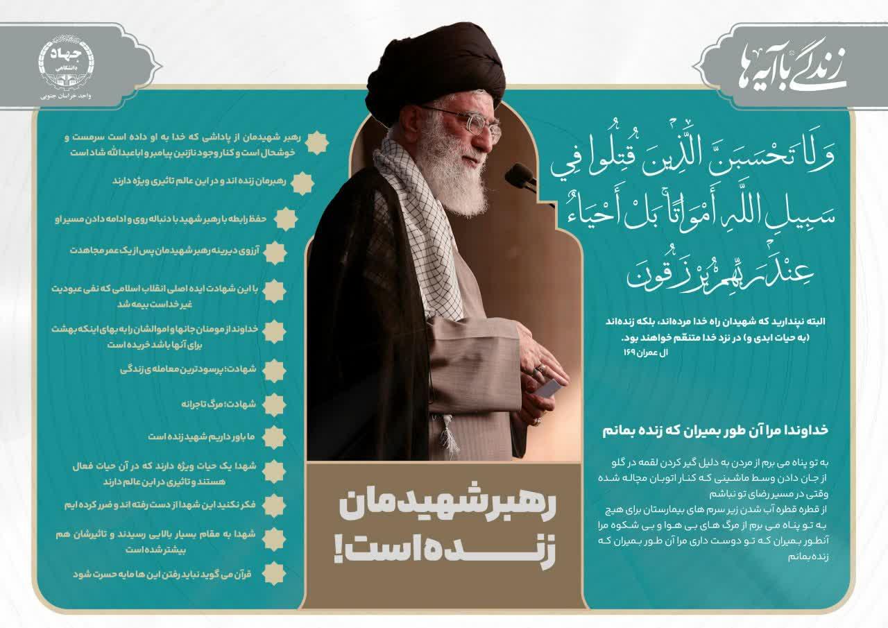 به گزارش روابط عمومی جهاددانشگاهی خراسان جنوبی، معاونت فرهنگی جهاددانشگاهی خراسان جنوبی در ادامه فعالیتهای خود برای تبیین مفاهیم قرآنی، تازهترین طرح گرافیکی خود را با محوریت آیه ۱۶۹ سوره آلعمران منتشر کرد. این طرح با الهام از بیانات و رویکردهای رهبری در زمینه تبیین فرهنگ ایثار، شهادت و معنویت تولید شده است.