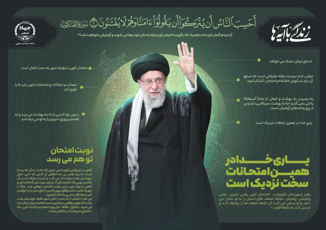 به گزارش روابط عمومی جهاددانشگاهی خراسان جنوبی، این طرح که با تمرکز بر مفهوم «آزمون ایمان» شکل گرفته است، میکوشد نگاه جامعه به صبوری و پایداری در مسیر ایمان را از زاویهای هنری و معرفتی و با توجه به بیانات رهبر شهید امت به تصویر بکشد.