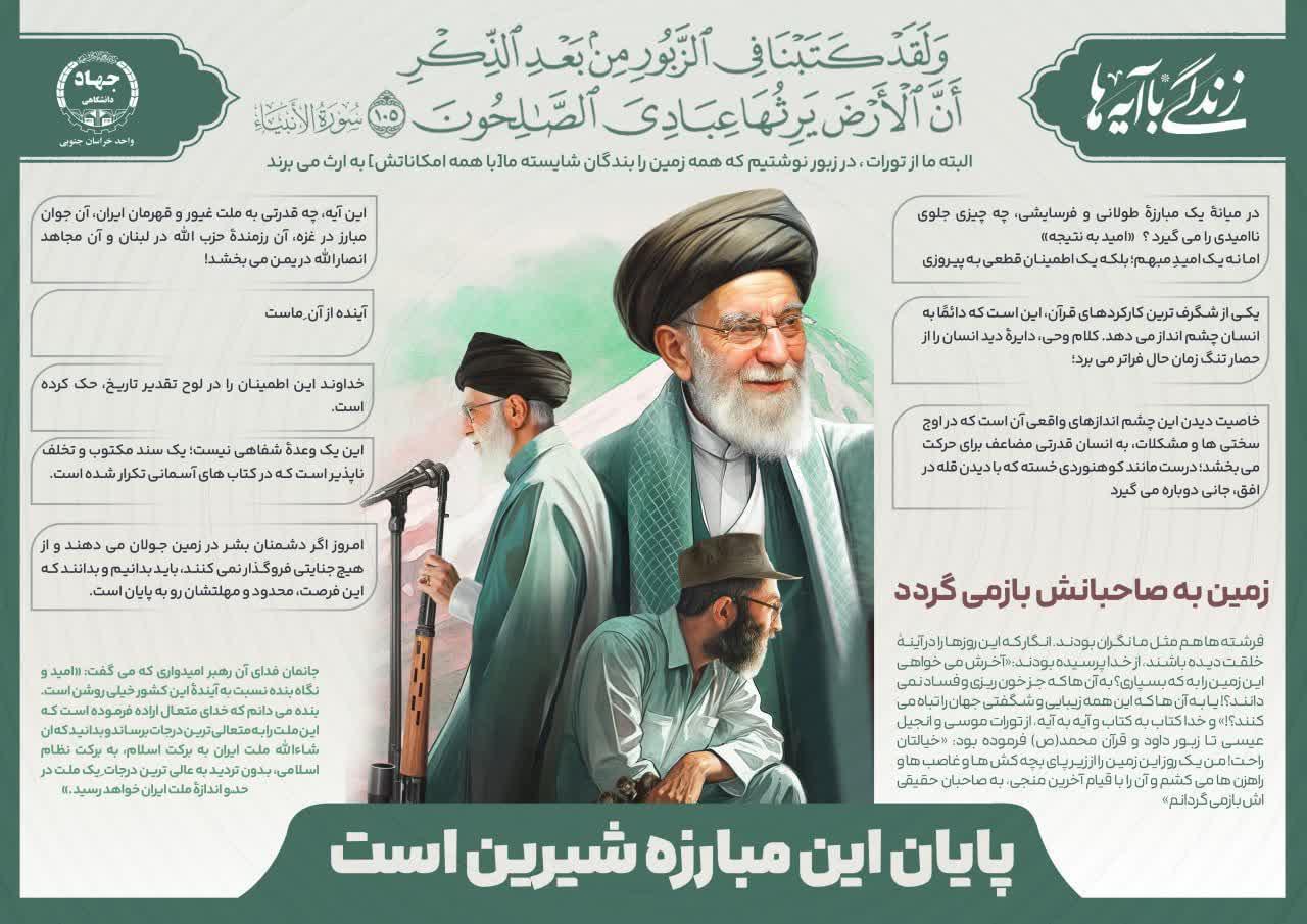 معاونت فرهنگی جهاد دانشگاهی خراسان جنوبی با محوریت آیه ۱۰۵ سوره انبیاء، طرح تازهای از طرح «زندگی با آیهها» را ارائه داد؛ طرحی که با تکیه بر وعده قطعی الهی، نگاه امیدوارانه و مسئولانهای به آینده جامعه ترسیم میکند.