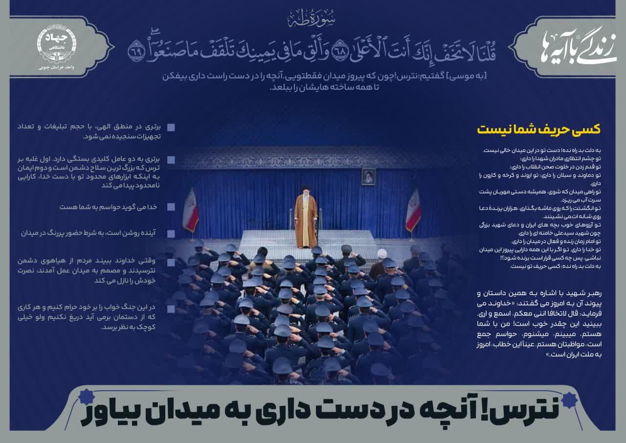 به گزارش روابط عمومی جهاددانشگاهی خراسان جنوبی، معاونت فرهنگی جهاد دانشگاهی خراسان جنوبی در ادامه پویش «زندگی با آیهها»، با محوریت آیات ۶۸ و ۶۹ سوره مبارکه طه، به تبیین راهبردهای قرآنی برای مواجهه با چالشها و هجمههای باطل پرداخت. این آیات که صحنه تقابل ایمانِ موسی (ع) با کید ساحران فرعونی را ترسیم میکند، حاوی درسی راهبردی برای عصر حاضر است.