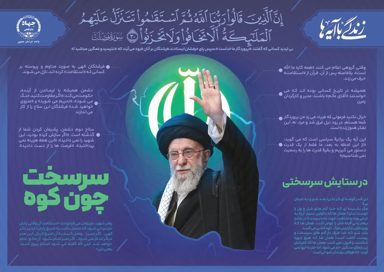 به گزارش روابط عمومی جهاددانشگاهی خراسان جنوبی، طرح «زندگی با آیهها» با استناد به آیه شریفه ۳۰ سوره مبارکه فصلت، بر اهمیت «استقامت» بر توحید و رهنمودهای الهی تأکید میکند. این آیه شریفه، پاداش کسانی را که با اخلاص، پروردگار خود را «الله» مینامند و بر این پیمان الهی پایدار میمانند، نازل شدن فرشتگان و بشارت عدم ترس و اندوه و دریافت بهشت موعود عنوان میکند. این اصل بنیادین، در سیره عملی رهبر شهید انقلاب، به وضوح تجلی یافته است.